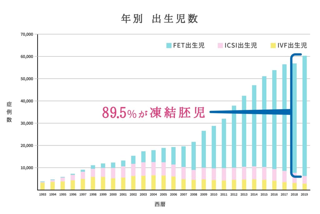 | メリット | 余剰胚の凍結保存により再度採卵することが避けられる 一度に1個ずつ移植でき結果的に多胎のリスクが減る 全胚凍結により卵巣過剰刺激症候群のリスクが減る 排卵誘発剤により子宮環境が悪くなっている可能性のある採卵周期での移植を避けられる 刺激周期の新鮮胚移植に比し、妊娠率が高い |