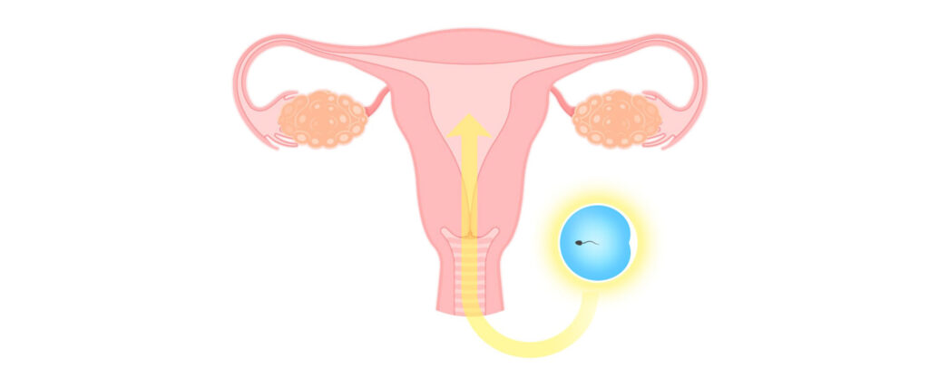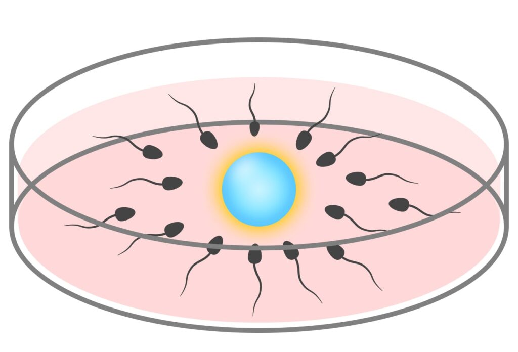 排卵する前の卵子を卵巣から取り出し(採卵)、あらかじめ採取しておいた良好運動精子を一つの卵子にふりかけて受精させる方法です。受精が確認されたら培養室にて2〜5日間観察し、正常に発育が見られる受精卵(胚)を子宮内へ移植します。
